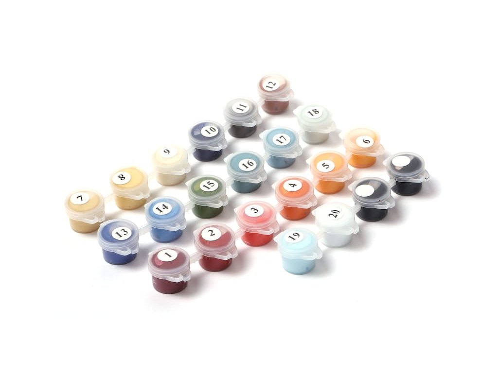 Plátno napnuté na dřevěný rámeček a rozdělené na jednotlivá políčka. Každé políčko je očíslované v souladu s konkrétní barvou. Sada mj. obsahuje akrylové barvy, které mají také svá čísla. Abyste ve výsledku uviděli vrcholné dílo, stačí jen vybarvit každé pole odpovídající barvou.